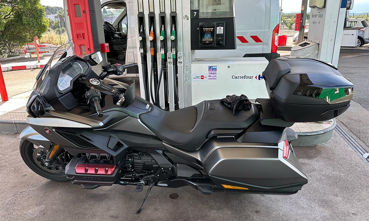 La photo habituelle du départ de la balade moto, ici à Antibes à la station essence de Carrefour. Très importante cette photo. Laurent, mon ami motard Breton y tient. C’est une tradition. Photo de la moto Goldwing, donc, au départ d’Antibes. Tout semble ok concernant la moto. Sac de voyage et sac à dos dans le top case, les valises sont pour ainsi dire vide. A droite, elle est vide. A gauche, j’ai une paire de basket et une bouteille d’eau. Je pars en Corse pour 4 jours seulement.
