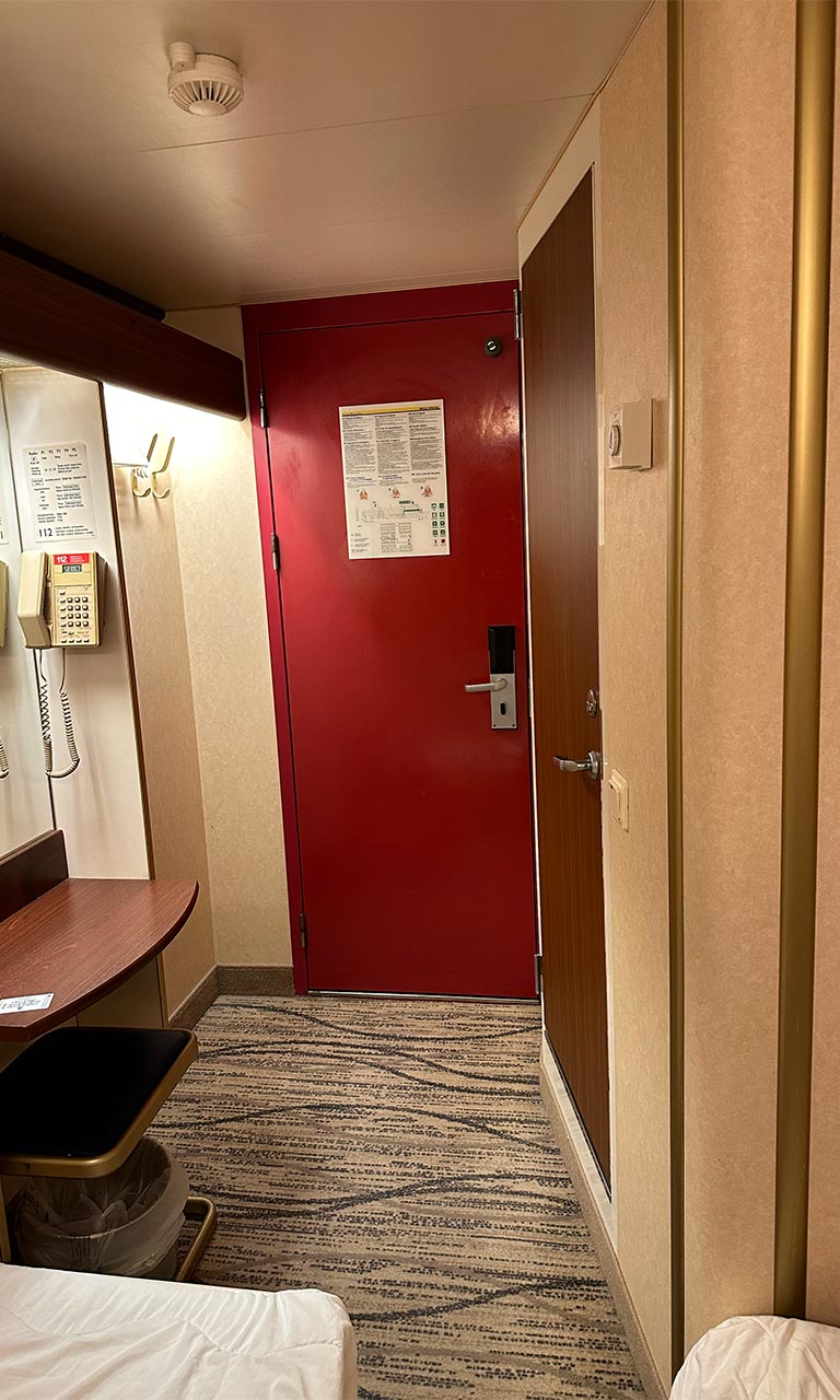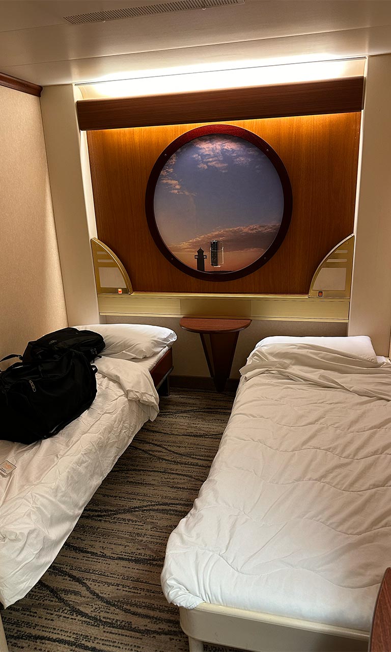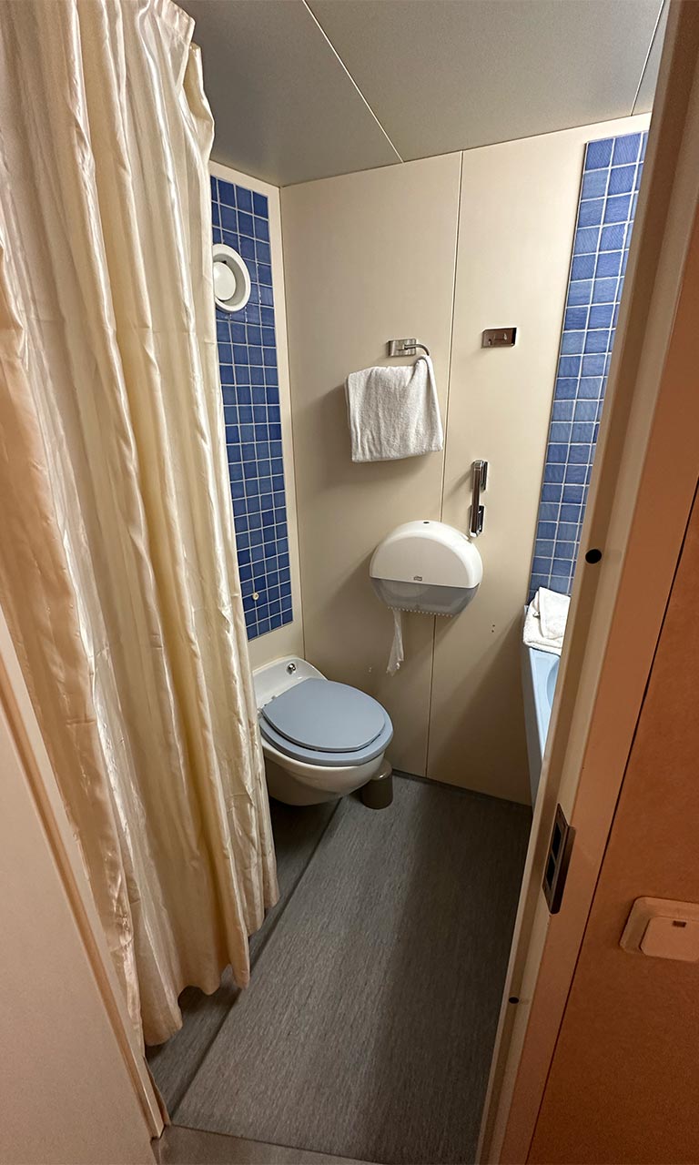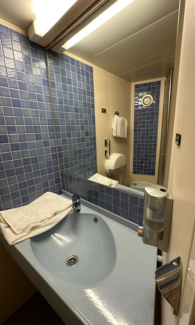 Après c’est à vous de voir, mais lorsque je traverse de nuit, je prends forcément une cabine. La dernière fois j’avais pris une cabine Luxe avec hublot et lit double. Cette cabine est facturée en moyenne 130€ la nuit. Cette fois pour cette traversée, je suis allé à l’économie, pas de hublot. Inutile en même temps, en partant de nuit, on ne voit rien dehors. La cabine ne sert qu’à dormir ou se reposer. Ce que j’apprécie dans la cabine, c’est qu’elle dispose d’un WC privatif (propre à chaque fois) et d’une douche sans oublier le lavabo. Alors certes, c’est un petit budget en plus, mais quel confort !