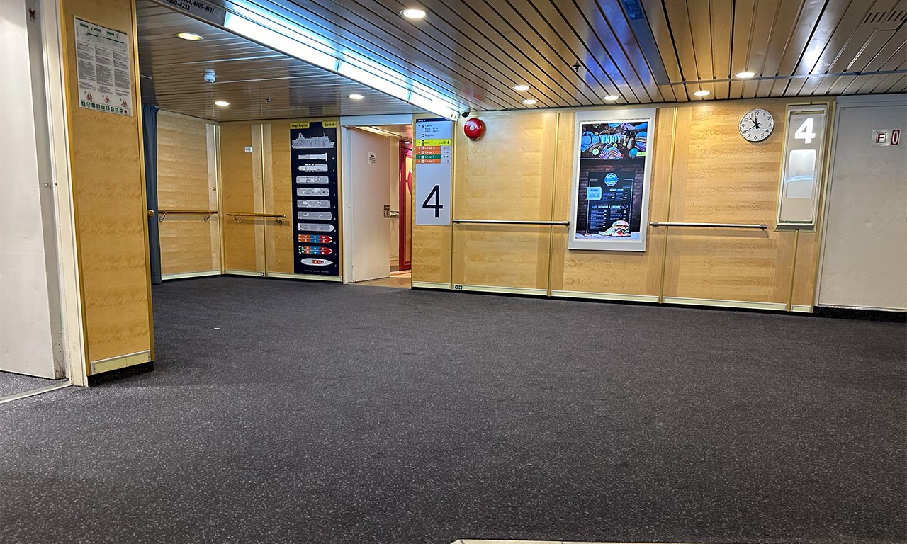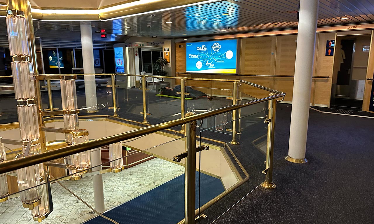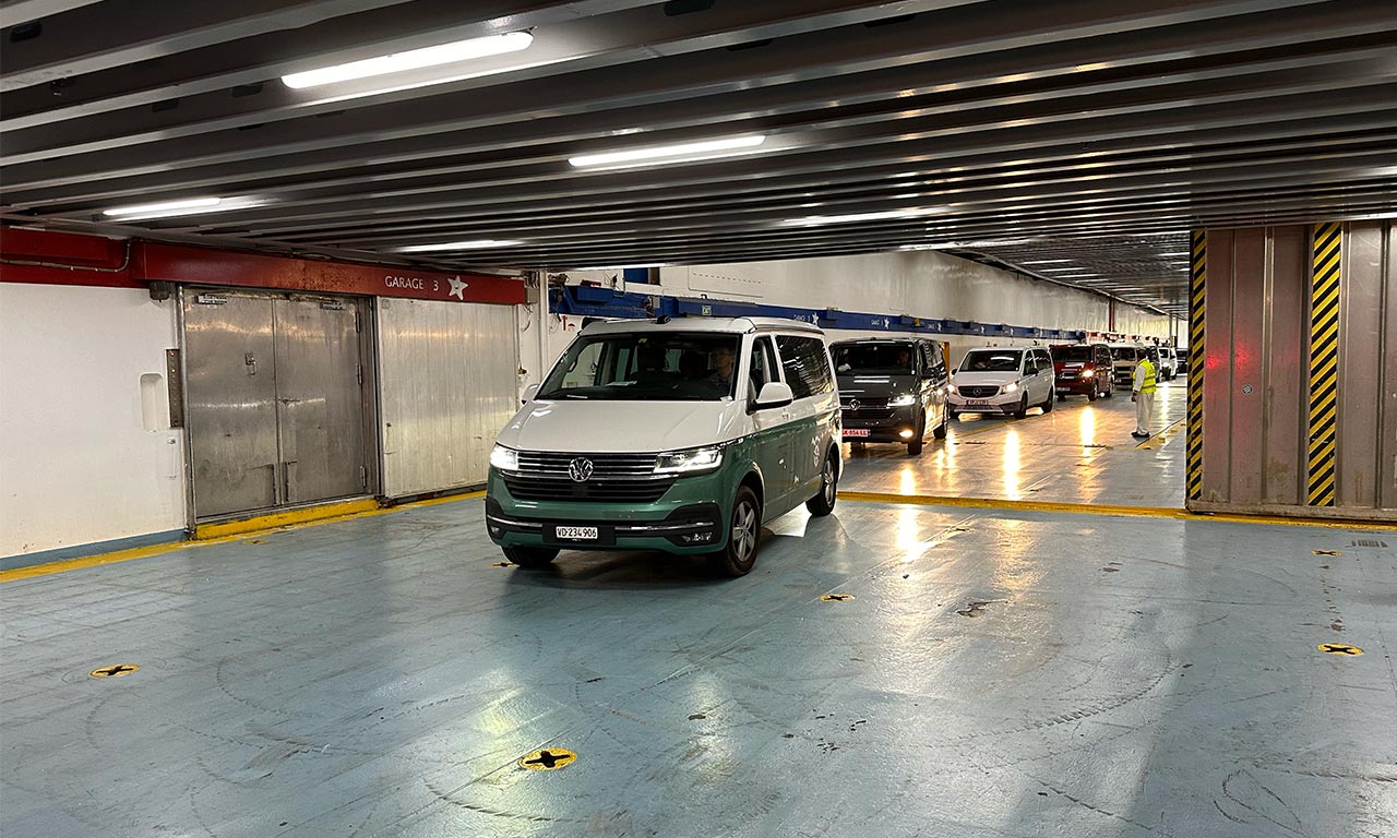 Une fois la moto arrimée au bateau, on prend ses affaires et l’on se rend au point info. Je recommande vivement de se souvenir à quel niveau se trouve votre véhicule pour le retrouver facilement le lendemain matin. Autre petite astuce, comme il faut très chaud dans les parkings, je vous recommande vivement d’enlever votre blouson et de le ranger dans une de vos valises. Vous me remercierez vu la fournaise dans les parkings. N’oubliez pas de désarmer votre alarme, au risque de vous retrouver sans batterie le lendemain matin.