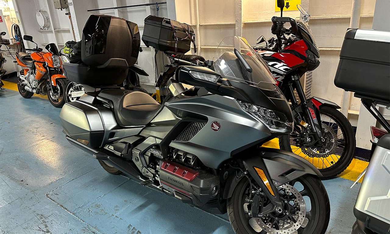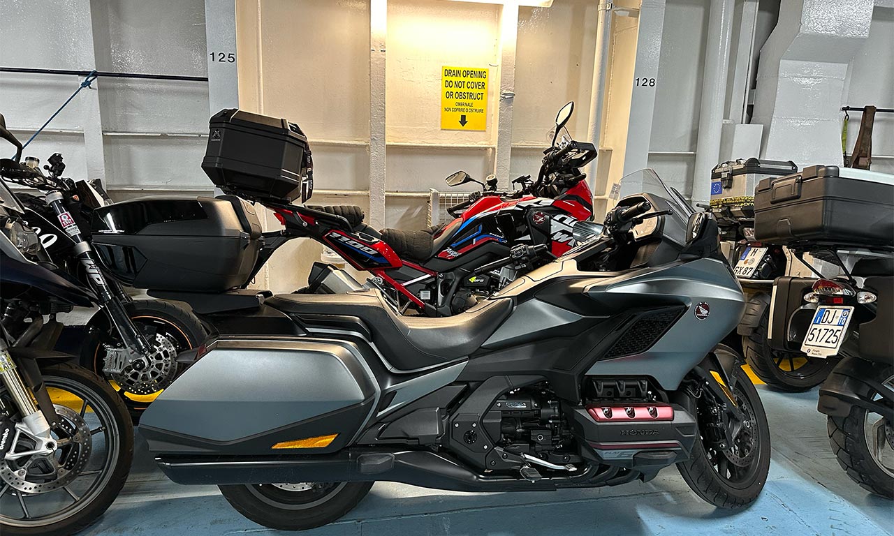 - Moto Goldwing dans le garage du bateau entre Savone et Bastia (Corsica Ferries)