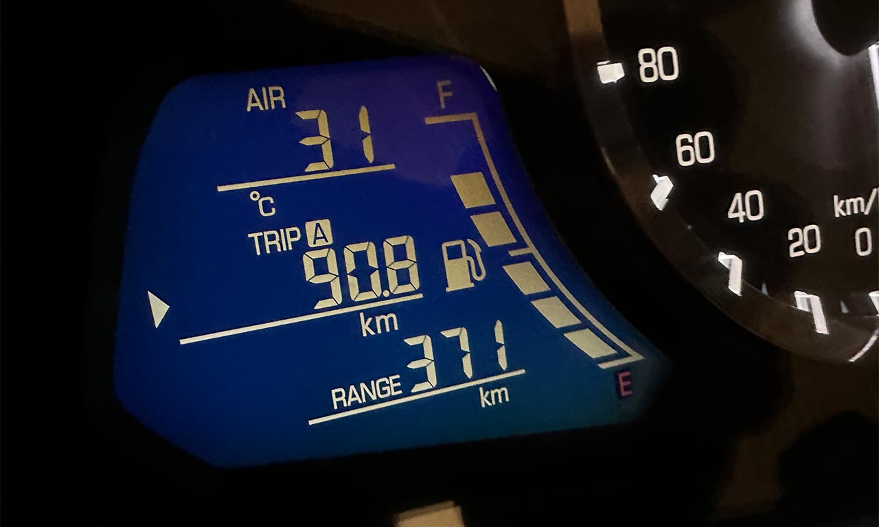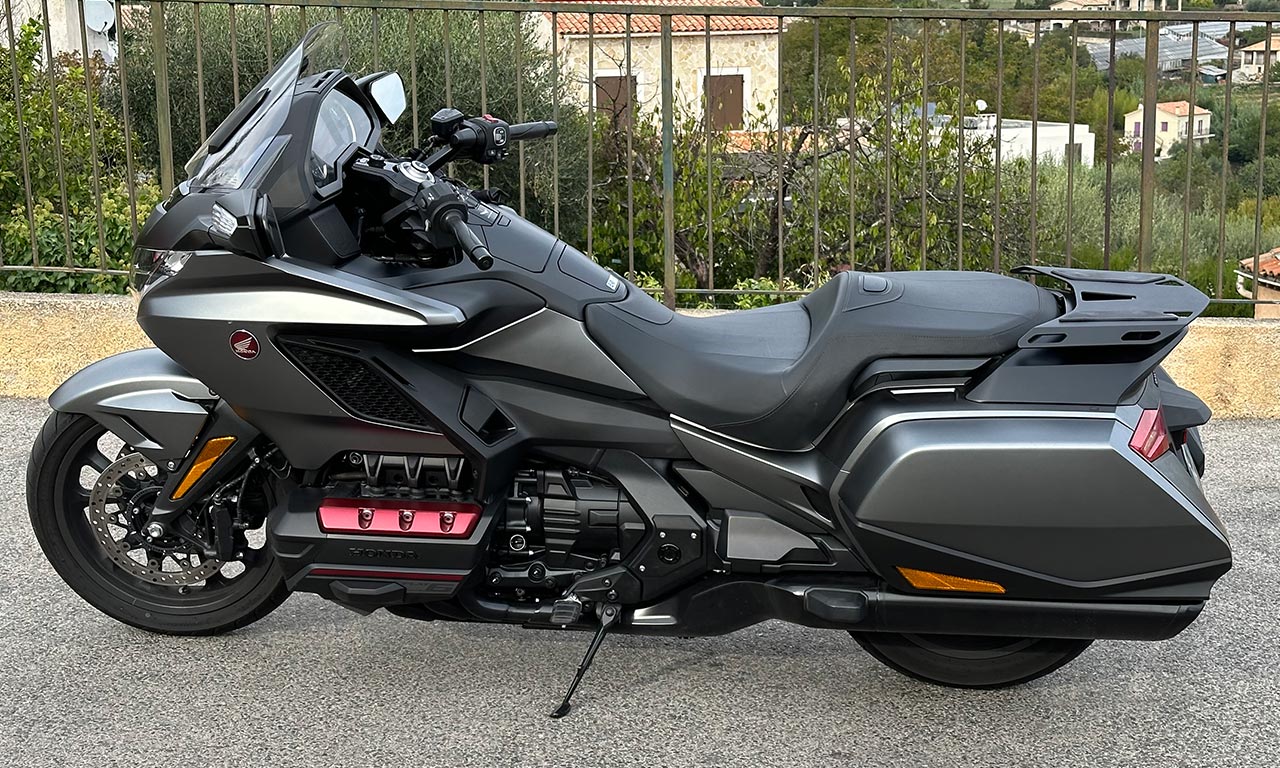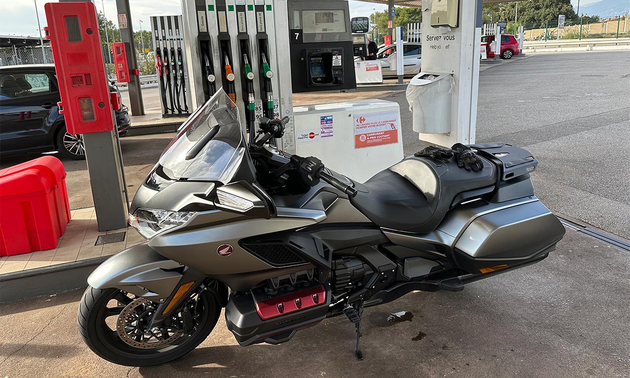 La photo du départ est tellement importante avec la prise de vue de la belle au niveau de la station essence. 1,84€ / litre de SP98. j’ai presque l’impression que c’est correct niveau prix, c’est grave docteur ? De toute façon ma belle Goldwing ne consomme pas plus de 5,5l/100km de ce que je peux constater à chaque retour de balade, autant dire que je suis super content de voir qu’elle ne consomme pas plus que mon (ex) TMAX 560.