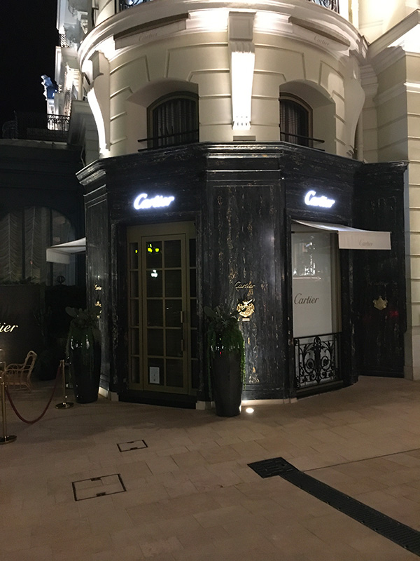 Dans le prolongement du bâtiment, une boutique de la maison « Cartier » que je trouve tout simplement magnifique. Du marbre en façade du plus bel effet, même si la boutique à l’intérieur est toute petite. Je trouve l’ensemble superbe !