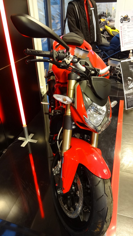 Pas mal non plus cette Streetfighter en version 848 même si je trouve que ma 1098 a tout même plus de charisme. J’aurais, tout de même, bien aimé l’essayer cette moto… on verra ça lorsque Ducati Rennes, l’enseigne Ducati devrais-je dire retrouvera preneur sur Rennes et ses alentours et en priant pour que ce ne soit pas la précédente équipe qui en hérite… ne nous fâchons pas quant à l’avenir d’un Ducati Store sur Rennes… juste un point… ce n’était surement pas la bonne méthode que de supprimer tous les accessoires du pilote… ça a fait déserter la clientèle fidèle qui achetait régulièrement des gants, des casques, des dorsales etc… je doute que ce fut la meilleure idée qu’il soit ! Bref… c’est du passé concernant Ducati Store à Rennes… dommage !