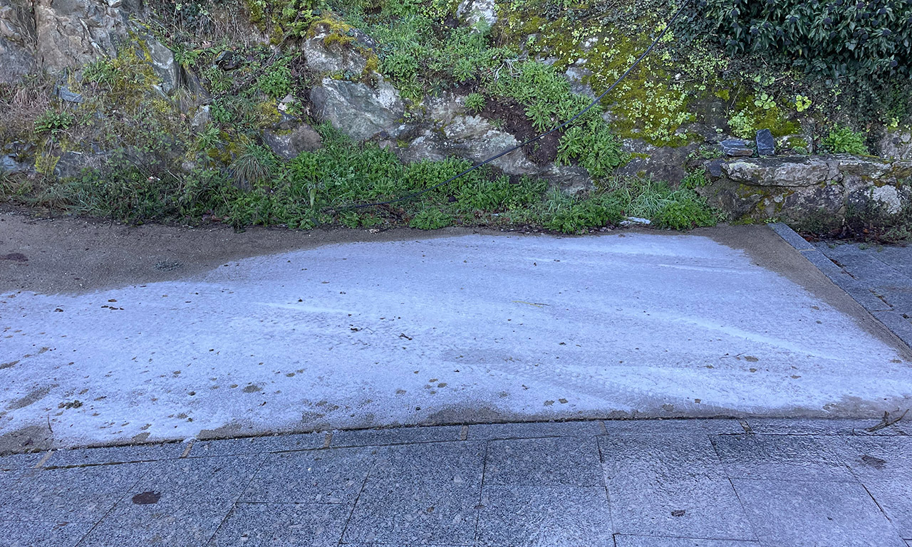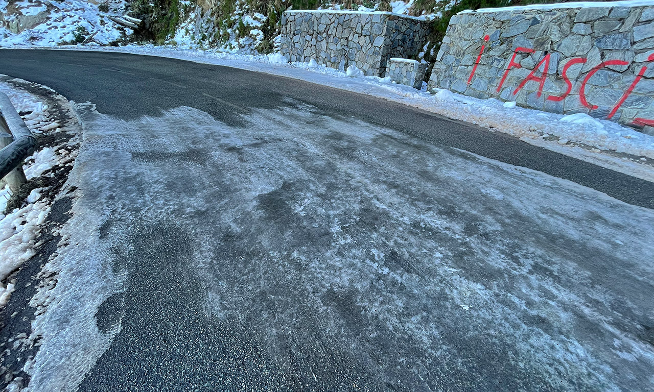 Je vous laisse deviner la belle frayeur que j’ai eu en arrivant là à moto. Je passe ou pas ? Ça se tente ou pas ? Bon, résumons la situation. J’ai une moto de 300kg un peu chargée. La selle est en position haute, le verglas ne semble pas être le revêtement le plus stable sur lequel on peut anticiper. Je suis côté Nord, c’est la première plaque de verglas que je croise mais y’en a peut être d’autres un peu plus loin… je crois que le demi tour est incontournable !