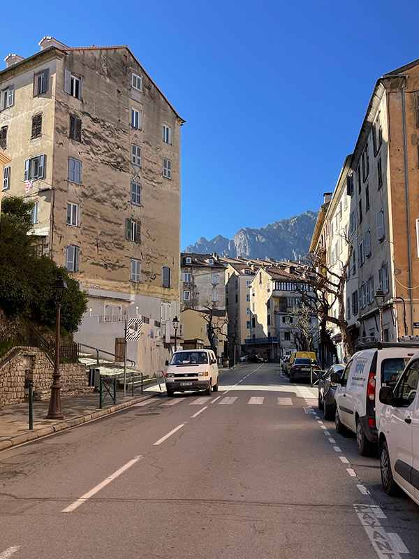 Corte est une ville Corse incroyable. En arrivant, on peut voir quelques maisons après une zone industrielle un peu triste, c’est vrai, mais dans une ambiance montagnarde que j’apprécie vraiment. En repartant, on contourne deux trois ronds points et on se retrouve face à la vieille ville où, effectivement, on constate une population plutôt jeune aux terrasses de café. Puis un peu plus loin (j’ai pas de photos) de nombreux bâtiments imposants, ce sont des universités qui sont posées là au milieu de Corte, c’est amusant de se dire que la jeunesse se trouve ici au coeur des montagnes…