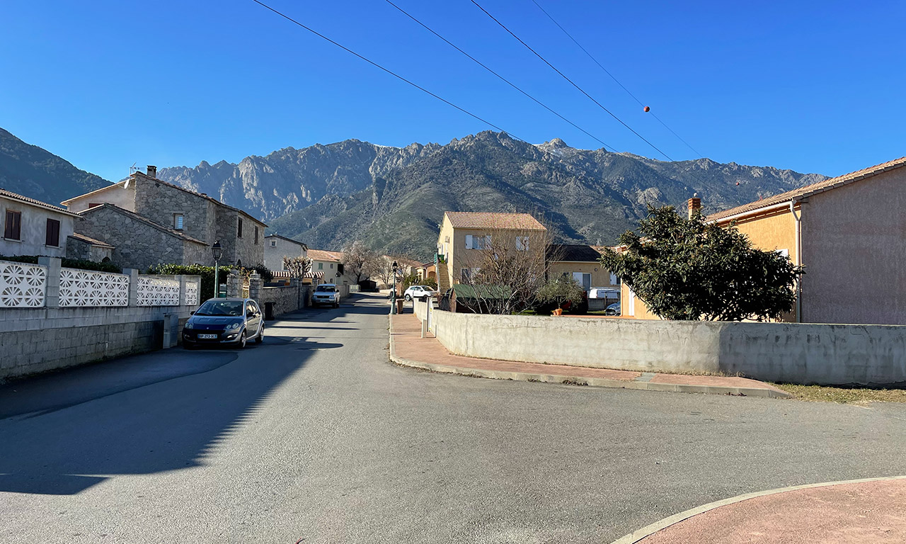 Cette photo illustre l’arrivée sur Corte, je me suis glissé dans les premiers lotissements (si on peut appeler ça ainsi) car je voulais prendre en photo cette ambiance avec les montagnes tout autour. Le ciel bleu, les montagnes, le paysage est magnifique.