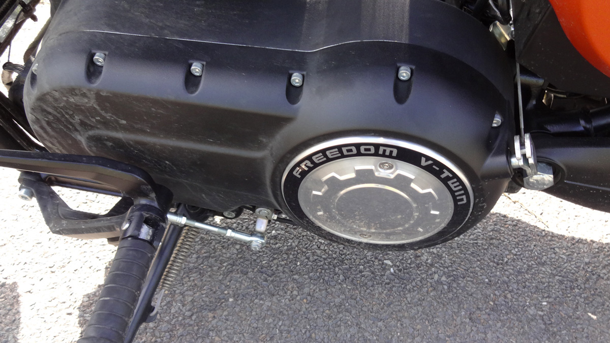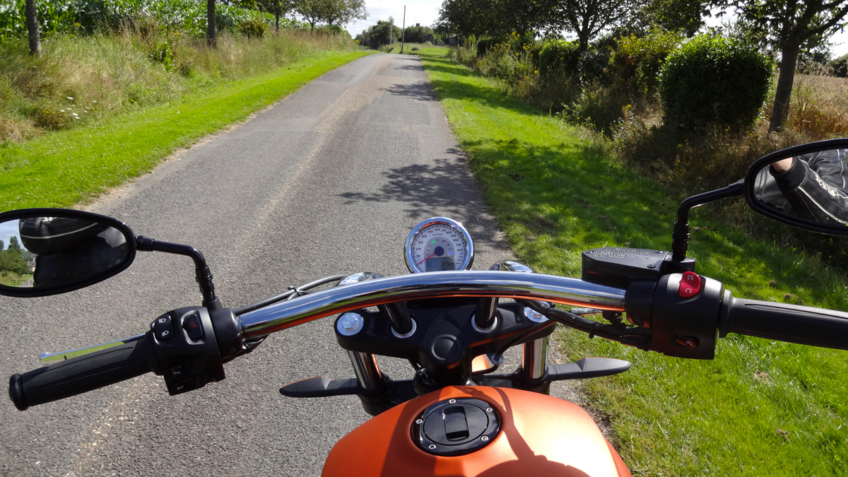 Une fois à bord, je trouve très vite mes marques. Les commandes de la moto me tombent bien sous la main, les poignées font grosses, rien de gênant par contre je trouve qu’il manque quelque chose devant… l’embrayage est doux mais la boîte de vitesse passe mal les vitesses et il manque le fameux Glonk comme on peut avoir sur les Harley avec la légère avancée de 5 cm vers l’avant sans le vouloir…
