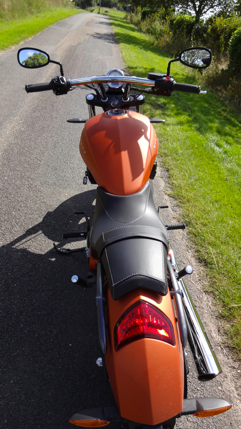 Nous sommes loin de la finition d’une Harley je trouve. Cette Victory n’est pas l’Harley du pauvre mais elle n’a pas le petit truc qu’une Harley offre… en roulant ou même à l’arrêt. Cette Victory me donne autant de frisson qu’en… qu’en… bien… je cherche encore…  il est là le truc, cette moto n’offre pas le frisson de la passion comme on peut avoir sur une Triumph Rocket III ou une Harley… Fat Boy (à ne pas confondre avec la Fat Bob)… et c’est bien dommage car il ne lui manque pas grand chose pour être plus alléchante qu’un Intruder ou Eliminator ou VN17 chez Kawa… pourtant je la trouve superbe dans sa robe orange, mais il manque de petit détail pour faire une réelle différence…