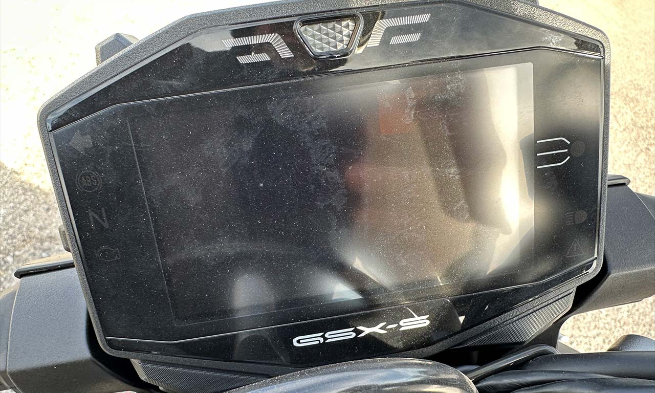 Sincèrement ce n’est pas ce tableau de bord qui sera l’argument pour fondre sur la bouille et l’ergonomie générale du GSX S 950. L’écran est brouillon une fois allumé, et on ne voit rien dessus. C’est franchement dommage pour une telle moto de lui coller un écran aussi minable !