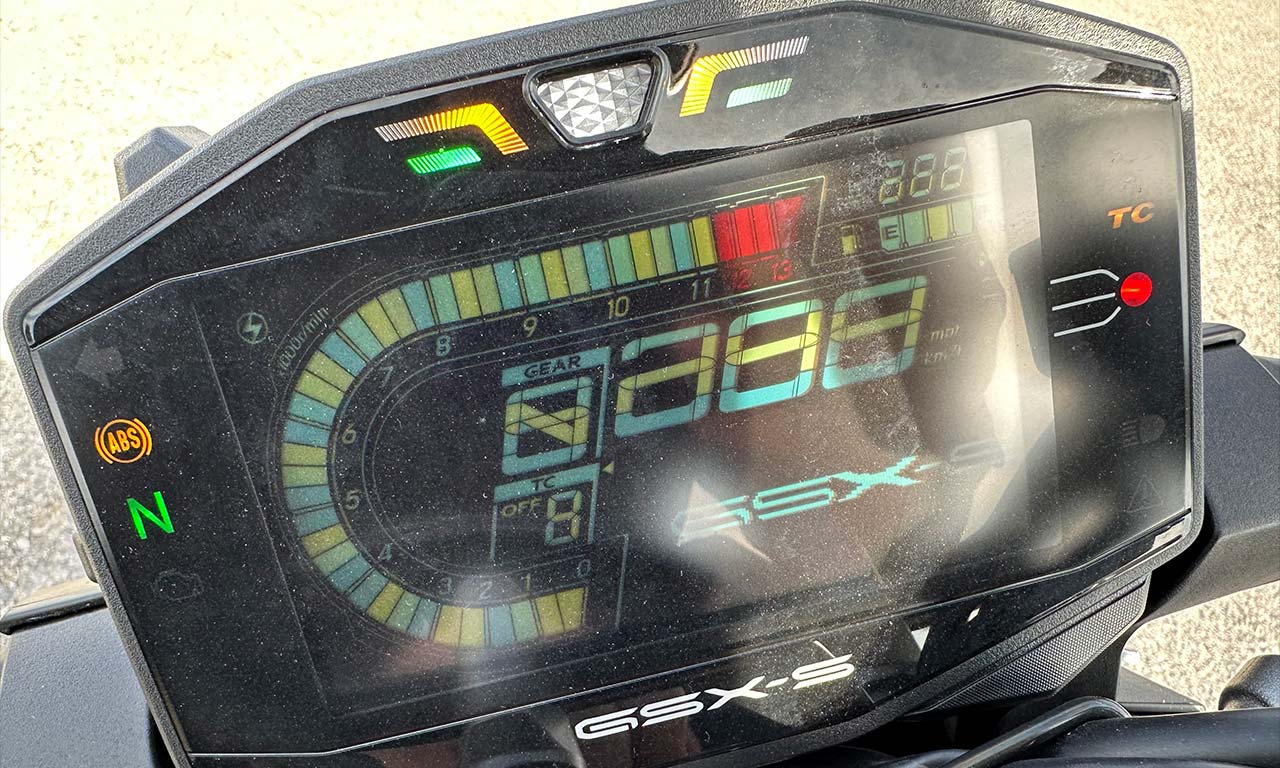bon, au final, je pense que j’aimais autant quand il était éteint. On peut voir que la moto à 9km au compteur. Pour tout le reste, c’est tout simplement imbuvable et sans intérêt. D’ailleurs sur la GSX S 950, ne cherchez pas de mode moteur, il n’y en a pas. A se demander à quoi servent les comodo sur le guidon pour le coup. On peut simplement jouer sur le TCS et ce sur 3 niveaux plus ou moins intrusif. Bof !