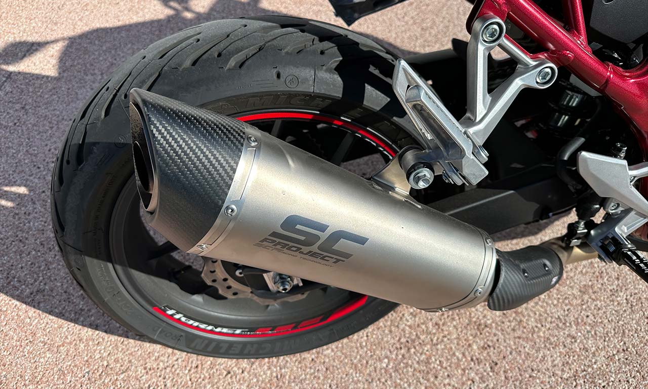 Si vous n’aviez pas fait attention, la moto qui m’est prêtée est quelque peu optionnée avec un saut de vent, embout de guidon, capot de selle (pas visible sur les photos), un quick shifter up & down, des reposes pieds, et un échappement SC Project homologué.