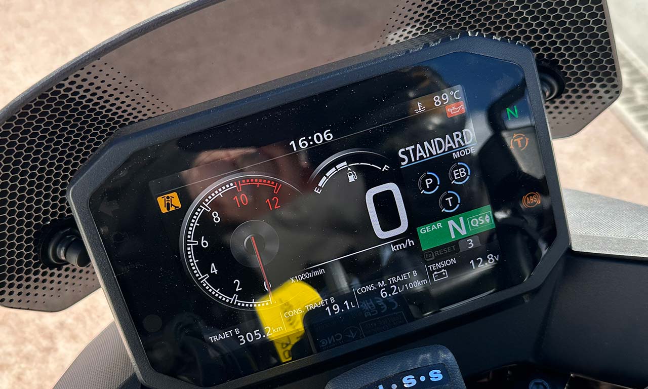 Le tableau de bord est vraiment complet avec de nombreuses informations et même un témoin de béquille latérale, ça peut être pratique pour les têtes en l’air. Différentes cartographies moteur (3 au total dont un mode totalement paramétrable par l’utilisateur). Entre le mode standard et le morde sport, la puissance est identique, jusqu’en mode sport, la puissance arrive plus vite dans la rotation de la poignée de gaz !