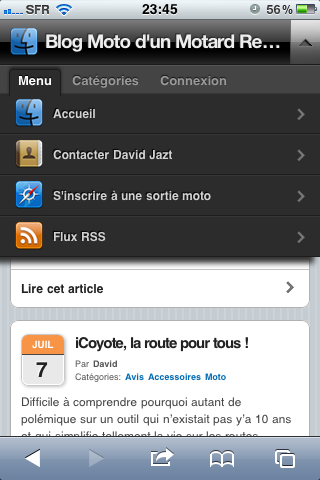 Tu peux ainsi profiter des menus, des catégories, du moteur de recherches, des flux RSS pour recevoir en « push » les actualités** directement sur ton mobile sans avoir à venir sur le site… c’est le contenu du site qui vient à toi !