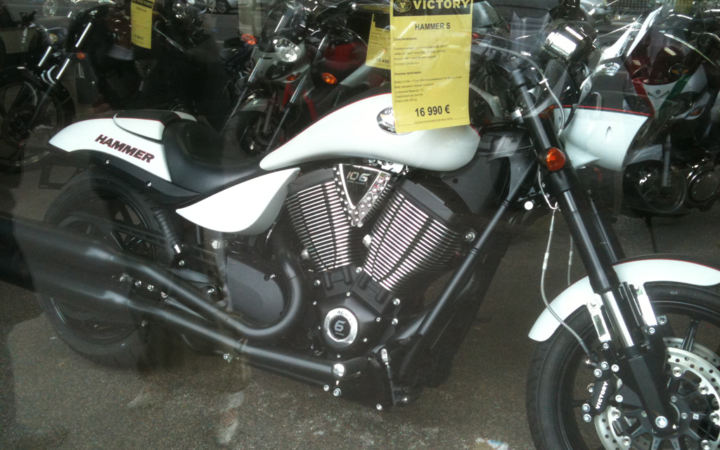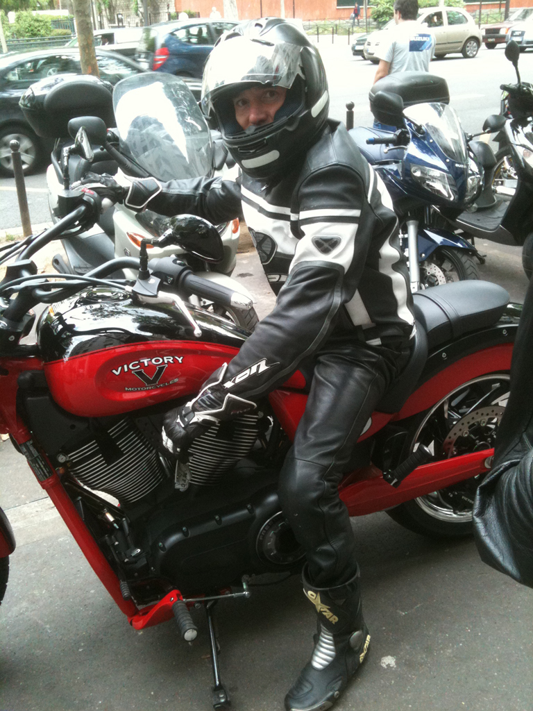 lá, on est calé et on a le guidon qui nous tend les bras. On l’attrape et tout de suite tout est naturel. 1ere, 2eme et 3eme…donc je confirme on peut s’arracher les bras 😉 le couple est present qui arrive instantanement. Pour ce qui est de la vibration de la moto et bien on peut dire qu’il y en a peu. La modernité du moteur y est pour quelquechose. Il y a juste ce qu’il fauqu’il faut pour un ressenti de la bête sans pour autant avoir les dents qui se déchaussent. Au point de vue maniabilité hyper bluffant pour pres de 300kg. Freinage egalement plutôt correcte pour ce type de machine. En tout cas on est vite propulsé par son moteur de 1700cm3 et 89ch ou 97 en stage2 😛 La vie a bord est tres ergonomique car tous tombent sous la main acces a l’ordi de bord via commodo placé main gauche (tres pratique et securisant). Enfin bref un regale pour ce tout petit test dans Paris. On pourrait presque dire que Victory c’est « une main de fer dans un gant de velour ».