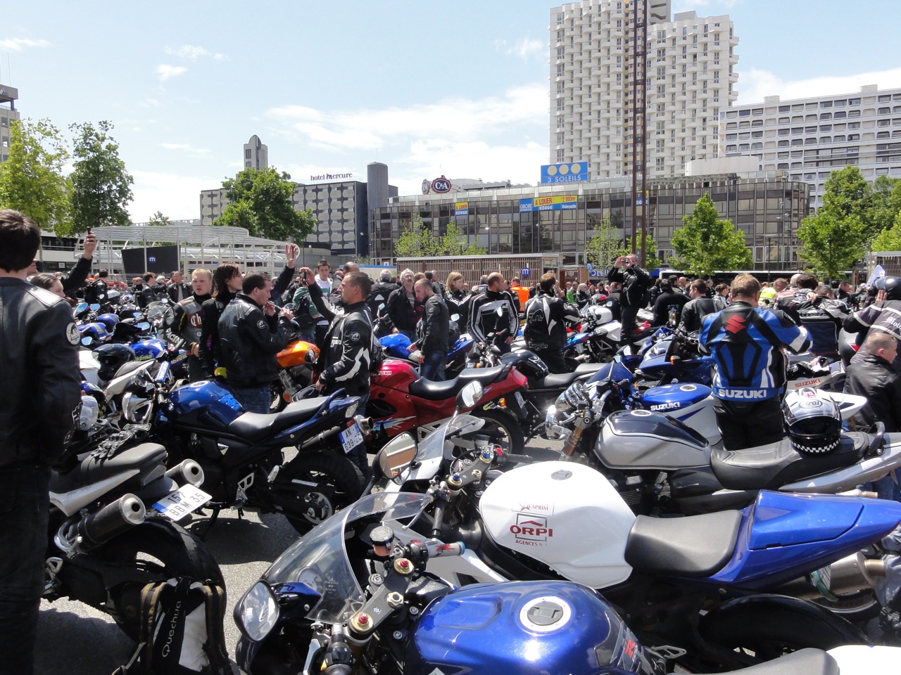 Une fois sur cette grande place, je me retrouve au milieu où il m’est impossible de partir, c’est un peu oppressant mais rien de dramatique. C’est une étrange sensation finalement où l’on se dit être entouré de personne ayant la même passion, et vu le temps ils sont forcément des motards extra ! Curieusement, et je ne sais pas si c’est l’effet pluie, mais y’avait pas de kéké ou de types qui s’amusent à remonter les files comme des mulets et à zigzaguer entre les motards au point de se mettre en danger… non, l’esprit était bon enfant…