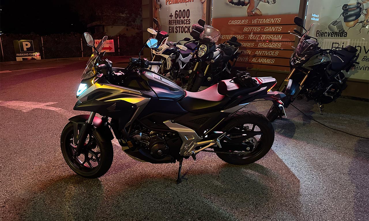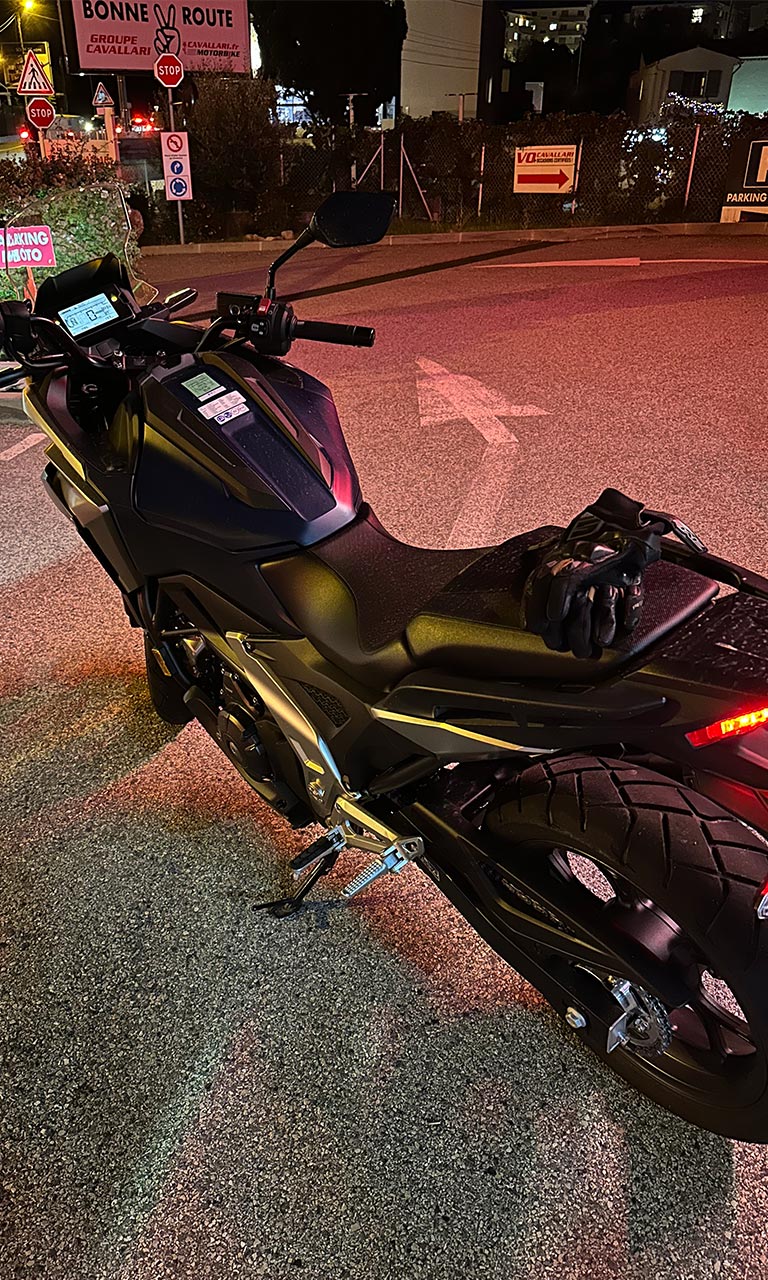 A première vue c’est une petite moto. Une fois à bord, du haut de mes 183cm, j’ai les jambes plutôt repliées, je suppose que sur une longue distance ça va être épuisant une telle position. Je pars de la concession en mode standard. La boîte automatique DCT est plutôt agréable à première vue et bien réactive.