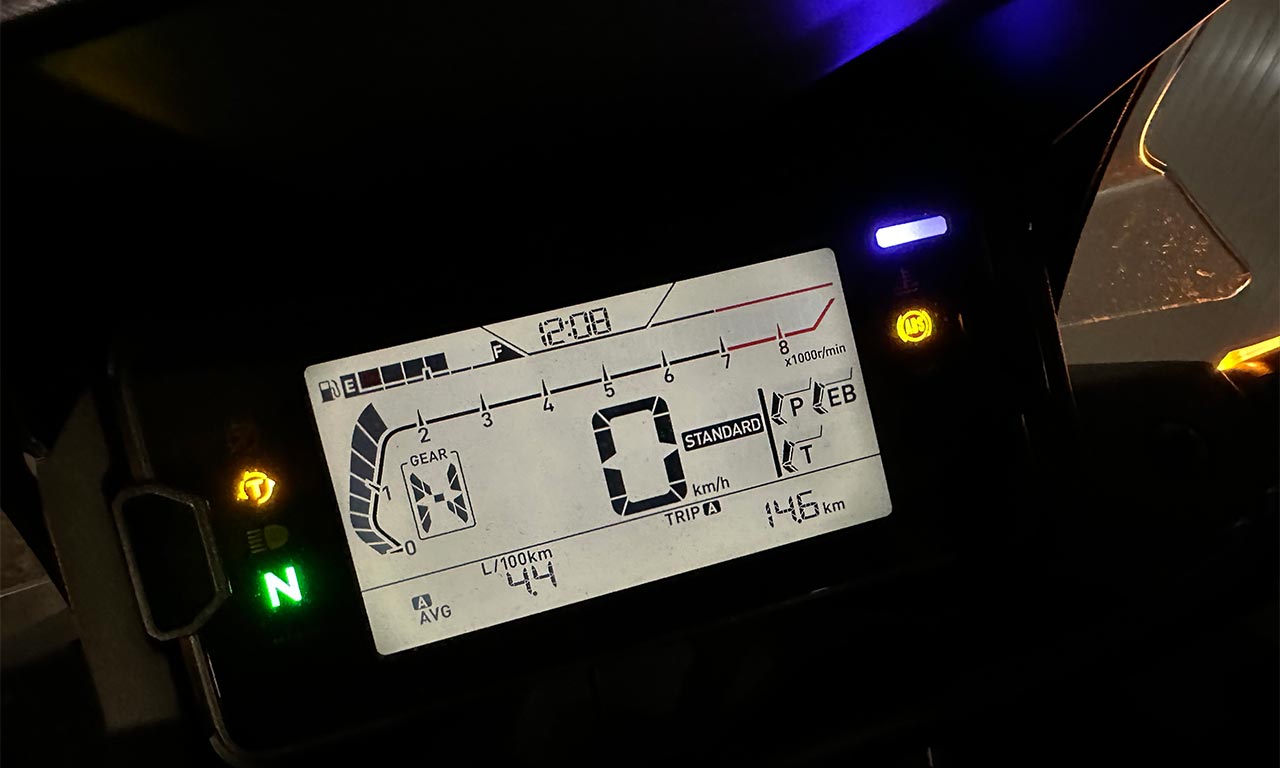 C’est un petit gabarit, ses roues de 17 pouces à l’avant et à l’arrière, son réservoir de 14 litres sous la selle, son tableau de bord complet et suffisant, le NC750X est une sorte de scooter avec une boîte automatique. Elle se laisse conduire comme un scooter, elle vibre beaucoup, mais ça fait parti de son charme.