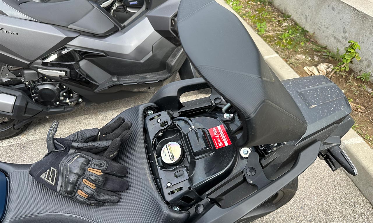 Deux moteurs identiques, juste le look qui change. Le NC750X coûte 9600€ contre 12000€ pour un Forza 750 contre 12900€ un XADV. Vu le confort de conduite, l’agrément, le faible risque de vol, le coût de l’assurance… le NC750X mériterait d’être un peu plus reconnu. On conserve une vraie position de conduite moto avec un truc entre les jambes. Le NC750 est bel et bien une moto et pourtant elle dispose d’un coffre sous le réservoir. Réservoir à essence qui se situe sous la selle.