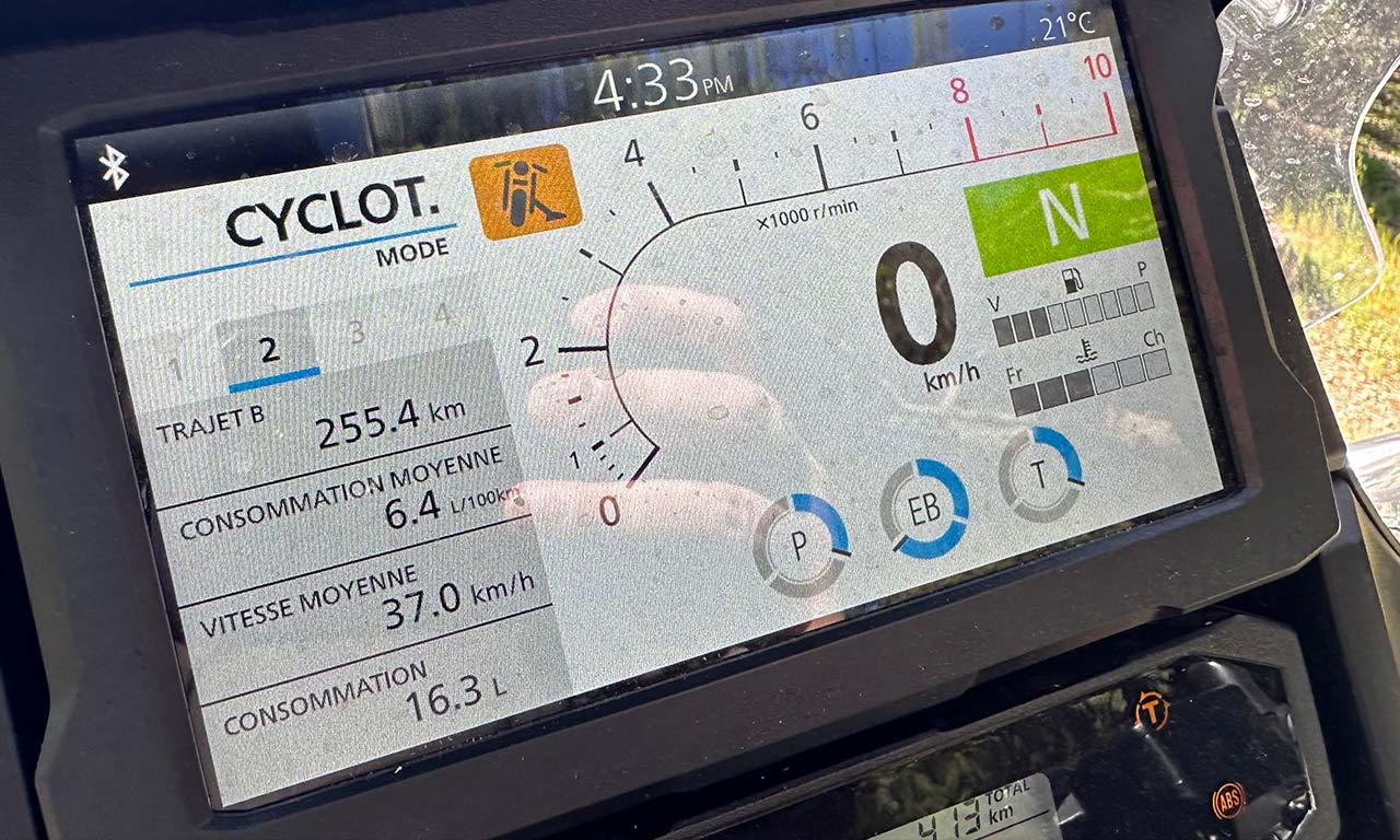 La vie à bord du NT1100 est plutôt agréable si l’on fait abstraction de la fourche particulièrement molle et pénible qui empêchera toute conduite un peu trop appuyée. Elle plonge à la moindre occasion, c’est franchement pénible. Pourquoi ne peut-on pas gérer la dureté ? En changeant l’huile peut être ? En dehors de ça, on retrouve les sensation d’une Africa Twin avec son tableau de bord double affichage qui ne sert à rien et le comportement de la boîte DCT entre l’Africa Twin et le XADV.