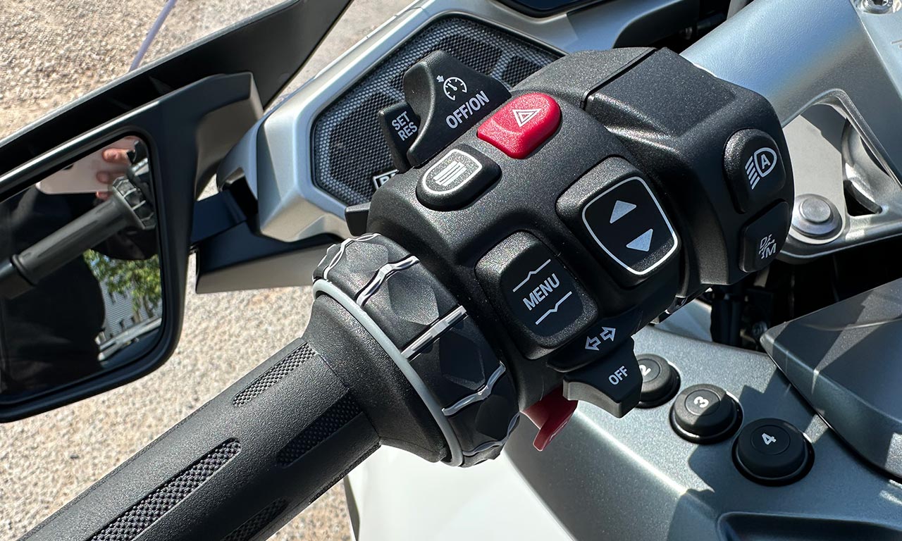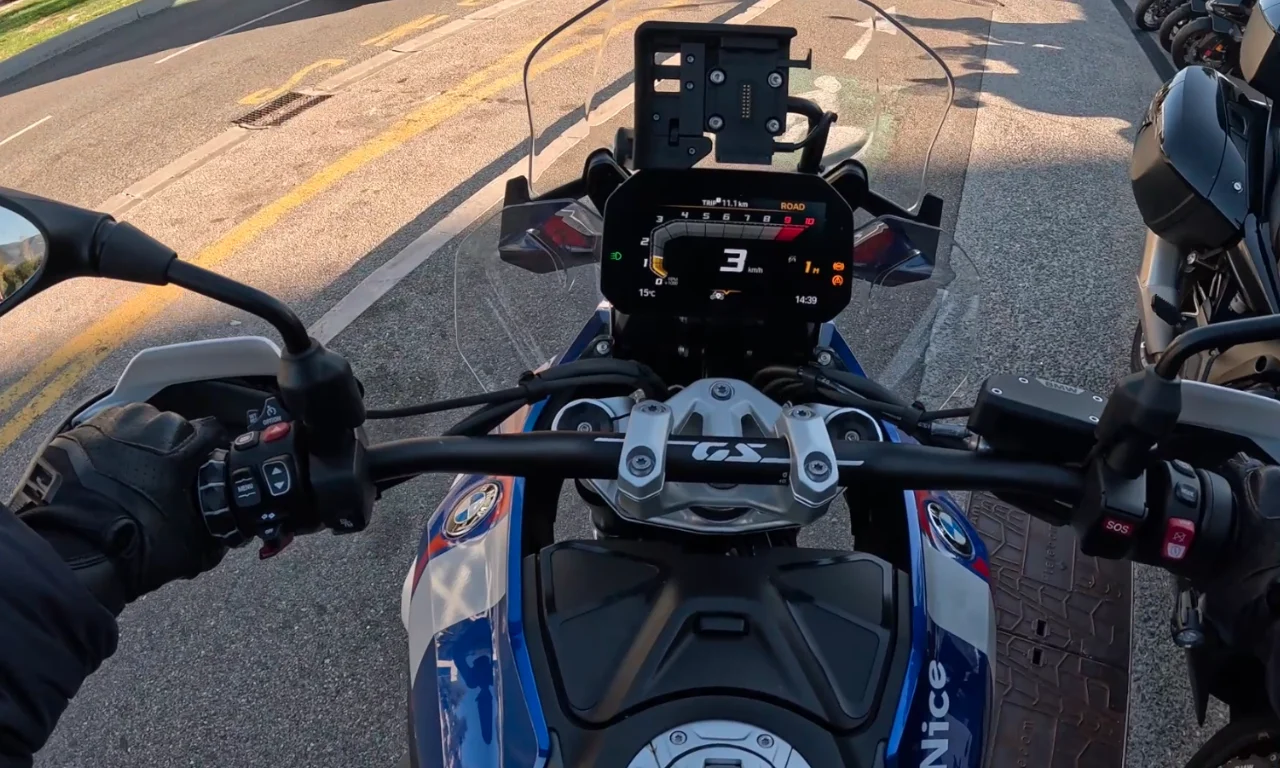 Lorsque l’on démarre la moto, ici équipée d’une boîte automatique, c’est-à-dire sans embrayage, nous devons actionner le frein avant et appuyer ensuite sur le démarreur. Sur une Honda équipée du DCT, le simple fait d’appuyer sur le démarrage de la moto suffit pour lancer le moteur. Toute la subtilité se situe à ce moment précis. Contrairement aux motos équipées d’une boîte DCT qui s’activent en mode automatique ou mode D dès le démarrage, les motos BMW passent immédiatement en mode manuel ou mode M.