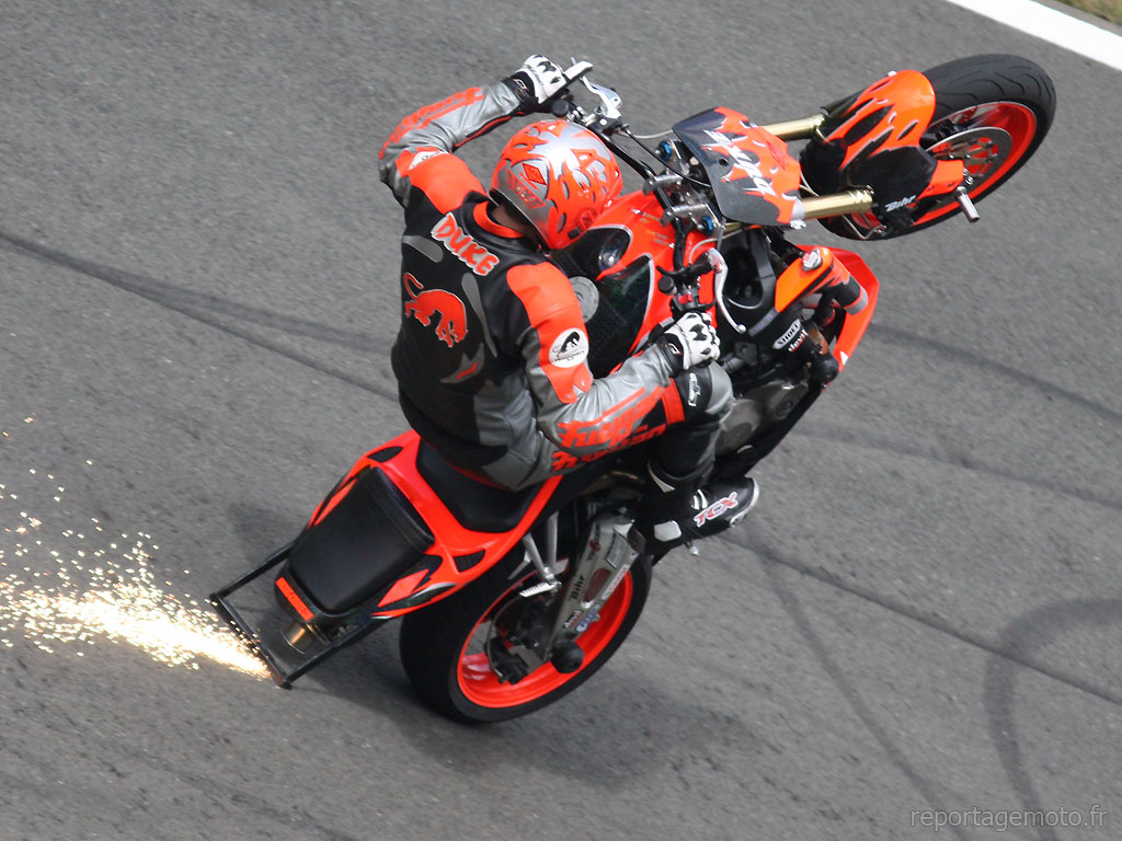 Pas évident de prendre une trajectoire dans le bon sens correctement à moto encore moins lorsque l’on réfléchi un peu trop et que l’on rechigne à pencher d’avantage de peur que les pneus nous fassent faux bon, un peu comme avec mes CORSA III actuellement. Bien voilà, le Stunter (motard faisant des acrobaties / Freestyle avec sa moto) lui se moque de tout ça… le Stunter lui relève ses manches et s’amuse avec sa monture comme toi tu t’amuses avec ta tondeuse… on tourne en rond, on contourne des poteaux, on soulève la roue avant, la roue arrière… on Stunt quoi !