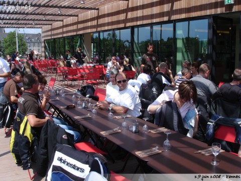 Un petit arrêt à Ploërmel où l’on commence à établir les directions de chacun. Nous nous séparerons à Maxens. Certains continuerons, d’autres comme nous avec Catherine irons directement vers Rennes afin de raccourcir encore un peu la balade qui commence à faire beaucoup, j’avoue. Heureusement qu’il n’y avait personne derrière moi, car là c’était un divorce assuré. Même moi qui aime vraiment la moto, je suis cassé en deux, je n’en peu plus… je ne rêve que d’une chose… boire quelque chose de bien frais en terrasse…