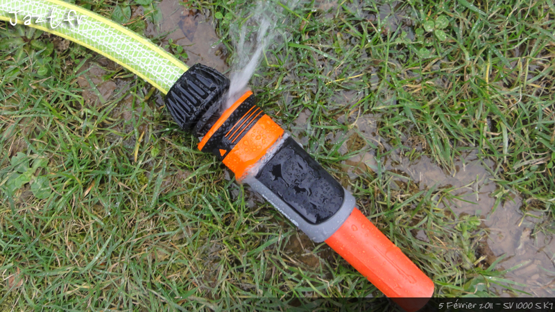 Donc pour ceux qui ont du mal avec les accessoires de jardin, ceci est un tuyau d’arrosage… très très pratique pour arroser le jardin et accessoirement pour laver auto, bateau, cyclo… bien sur, tout dépend à quoi est raccorder le tuyau, mais en général c’est de l’eau froide… pour laver la motocyclette, je recommande d’utiliser de l’eau tiède… ça aide à décoller la crasse urbaine… prendre un seau, y mettre deux ou trois dés de shampoing et laisser bien mousser sous le jet d’eau chaude… y glisser une éponge à carrosserie !