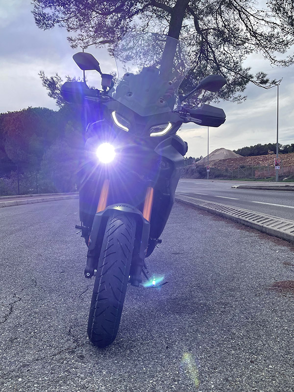 Un point qui n’a rien à voir, c’est son look. Je le trouve incroyable, dans la lignée du R1 pour un Trail, c’est tout de même un comble de style, non ? Ensuite, peut-on réellement parlé d’un trail quand on retrouve une roue avant de 17 pouces, comme sur les roadsters ce qui me permet de retrouver les sensations d’une moto « normale ». Les T32 monté de série, en première monte, mettent vraiment en confiance, c’est vraiment agréable d’avoir de bons pneus dès la première monte. Yamaha aurait pu mettre du BT23… ouf ! Ces T32 chauffent vite je trouve et mettent en confiance le pilote rapidement à bord de la moto, c’est top ! Les séquences de freinages un peu appuyés offre un bon feeling sur le train avant même si pour moi le freinage de cette moto n’est pas le point fort de l’ensemble. Je lui reproche un manque de mordant sur l’attaque, il faut vraiment tirer le levier pour que ça freine quand on roule un peu fort…